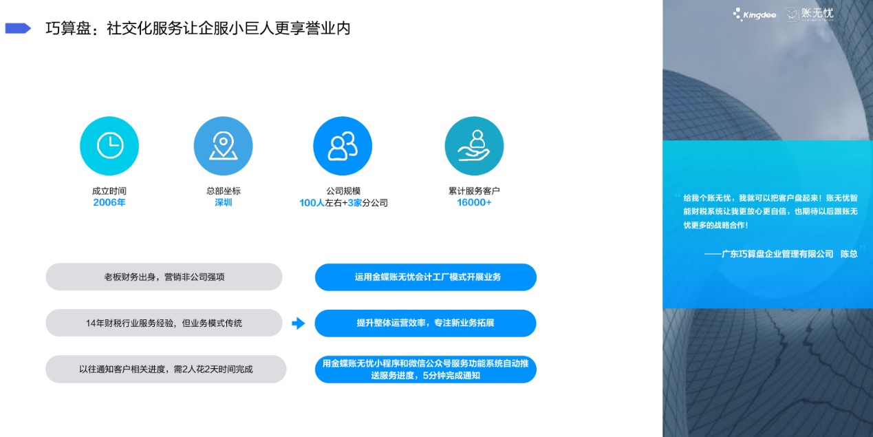 給我一個金蝶賬無憂,我就可以把客戶盤起來!金蝶賬無憂智能財稅系統讓我更放心、更自信,也期待以后跟金蝶賬無憂有更多的戰略合作!