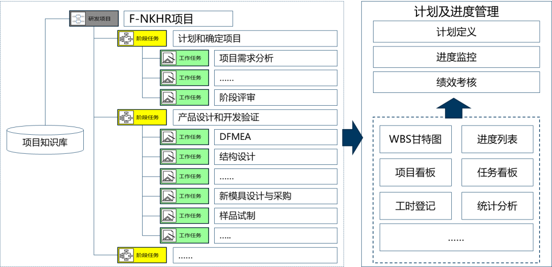 按照產(chǎn)品規(guī)劃階段定義的Offering級(jí)別,定義多種項(xiàng)目模板,適應(yīng)不同類(lèi)型研發(fā)項(xiàng)目,實(shí)現(xiàn)流程裁剪,即避免流程僵化過(guò)度管理,也避免必要的流程缺失導(dǎo)致出現(xiàn)質(zhì)量問(wèn)題;在流程模板中,按照IPD思想,設(shè)置矩陣式跨部門(mén)PDT項(xiàng)目團(tuán)隊(duì),職責(zé)清晰、高效協(xié)作;通過(guò)在項(xiàng)目模板中設(shè)置文檔交付物模版、任務(wù)檢查&測(cè)試項(xiàng)等管理要素,實(shí)現(xiàn)情景化知識(shí)推送,確保流程被規(guī)范化執(zhí)行;以項(xiàng)目WBS為主線,設(shè)置項(xiàng)目執(zhí)行過(guò)程中各種跨部門(mén)的端到端子流程,實(shí)現(xiàn)流程自動(dòng)驅(qū)動(dòng)。