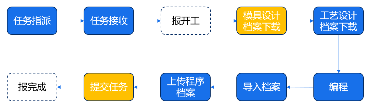 下面以編程設計舉例,編程設計的操作流程可大致拆解為接收任務、下載模具設計檔案、下載工藝檔案、導入檔案、編程、上傳程序檔案、提交任務等7大步驟。在上面的任務鏈條中,在下載模具設計檔案完成的時候,系統可以自動記錄為工程師任務的“開始”,在提交任務完成的時候,系統可以自動記錄為工程師任務的“完成”。當然,信息系統也可以針對企業的報工需求部署專門的報工功能,可參照圖2。