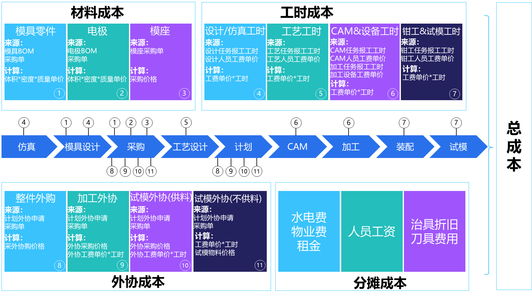 下面,我們以成本計算因子(工時成本,材料成本,外協成本和分攤成本)為主線,結合模具制造的業務階段,來解析模具成本的核算方式。