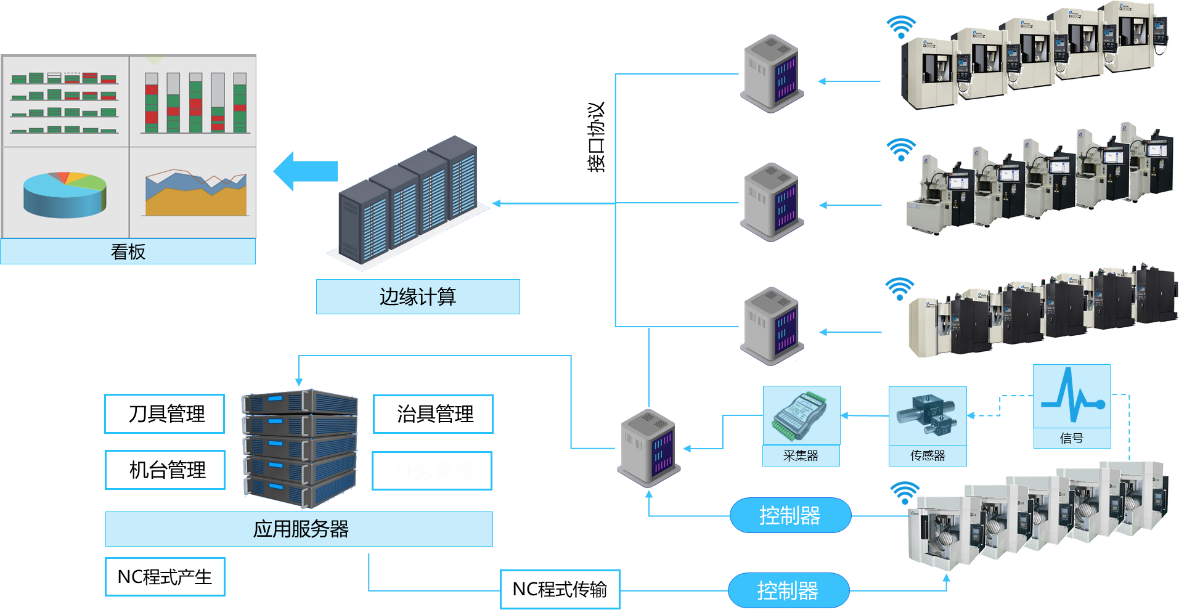 前期評估,模具設計,工藝設計,編程設計,裝配等只需要人工操作的部分,統計人員工時即可。但是在車間加工和試模的部分,則需要采集設備的工時。設備工時的采集,原理上相對人工工時比較簡單,但實現難度較大。需要將設備通過通信接口對接到信息系統(圖3),利用設備運行的時間和工單任務的對應關系,來獲取每個零件加工的設備工時。